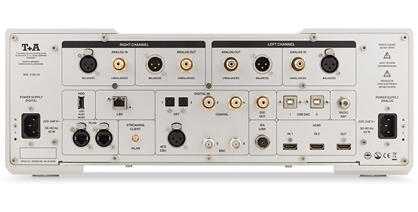 丰富的数字输入,AES/EBU、同轴、光纤、BNC、USB等一应俱全。USB输入不仅有供计算机串流使用的Type-B,最高可支持PCM 768KHz和DSD1024的顶规取样率,更有供读取外接储存装置的Type-A USB。除此之外,它还内建HDMI的输入与输出,可供连接剧院系统,且有一个称为IPA的端子,专供连接PDT3100 HV Reference转盘使用。如果您买了这一套T+A的旗舰讯源,原厂建议优先使用IPA连接。在串流方面,几乎什么格式都能吃的下,用家大可放心。本身还支持Tidal, Deezer, qobuz等串流服务,只要您是这些服务商的会员,就可以直接在SD3100 HV上聆听这些丰富的无压缩在线音乐资源。支不支援Roon Ready呢?原厂表示,目前SD3100 HV还在审核过程,不久后便会通过审核。