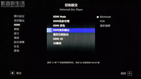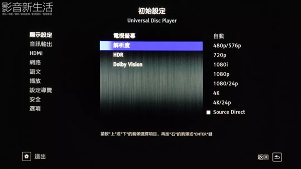 这次笔者先着重介绍UDP-LX500在影像方面的表现。首先该机的HDMI输出可以通过设置选择声画同时输出或纯音频输出,更进一步来说,还可以针对色彩空间、解析度等进一步调整。当然也可以切换Reference、Projector、OLED与LCD等4种模式,每种模式都可以再做亮度、对比、色相、色度、锐利度、数位噪声抑制与HDR-SDR调整。尤其是HDR-SDR调整的选项,只要您正在使用的电视或投影机是不兼容HDR技术,通过这项转换功能,可以让您使用的显示设备呈现出更丰富的光影细节和亮度。