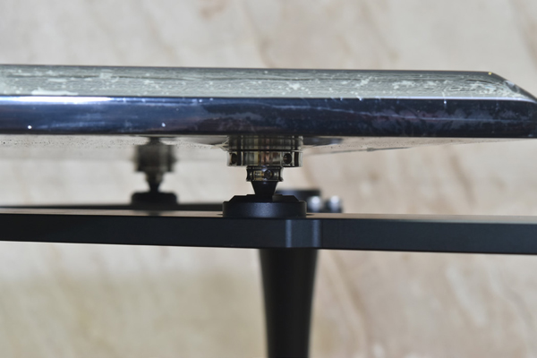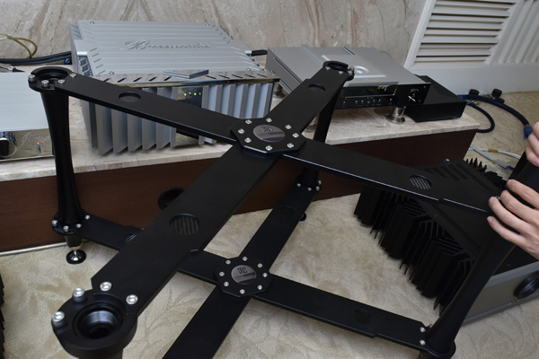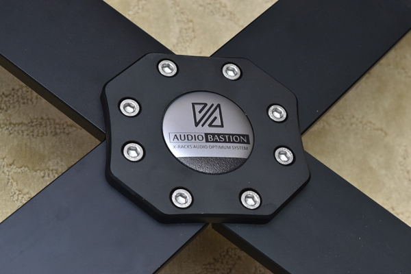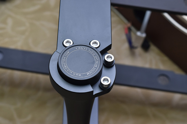 来看到音响架本体的核心结构,在放上层板之前,可以看到最引人注意的地方就是那形成「 X」型的水平铝合金支架,我想这也是为何型号要以「 X」命名的原因。根据代理商小江表示,这个架构的概念是仿效建筑工程里面的H型钢骨结构,把它改造成现在看到的X型;最主要的性能就是可以让振动不会累积在同一处,而是可以平均分散并导除出去。在X型铝合金支架的接合处,其每根螺丝也都可以微调,可以让密合度更高、整体更稳固。
