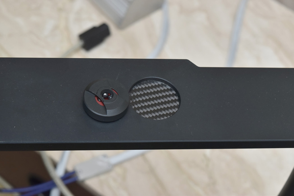 04. 在铝合金支架与上头层板连接的地方,会安置上这样的脚座,可以注意到在脚座底部还用上了碳纤维板,而脚座本身也具备复杂的瓷珠抑振构造。