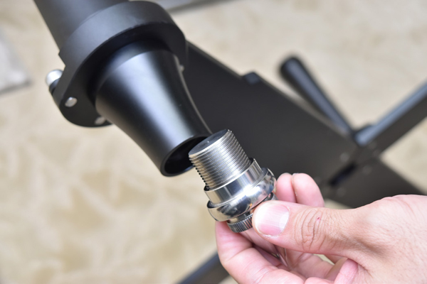 而在层板、 X型支架的垂直边,则是以旋入的方式安装类似哑铃形状的垂直铝合金管柱,这些管柱可在原厂官网看到也有分不同长度,可以依照器材的高度来选择搭配;根据小江的说法,这些管柱还可以另行灌沙,就能再增添稳定度。而在所有管柱的最下方,四支脚则安装各一组由整块铝合金下去车制的超厚实角锥来接触地面。
