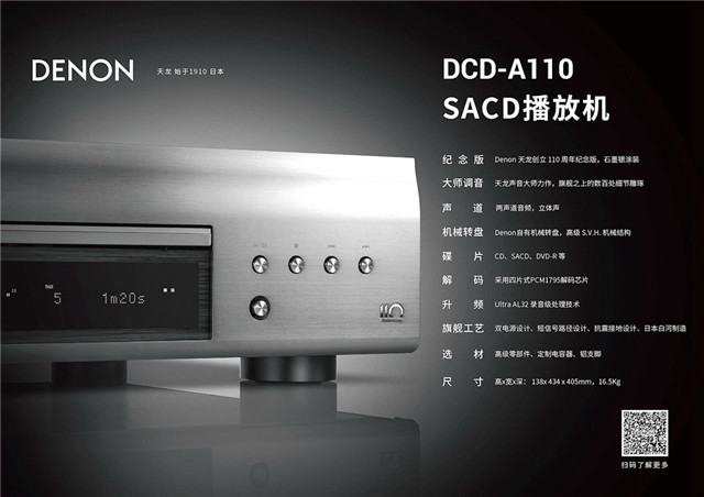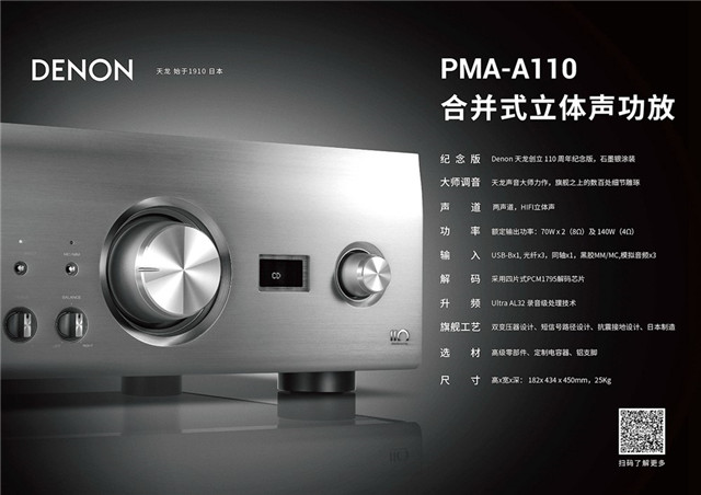2020年,正是 DENON公司成立110周年。为了庆祝这一特殊历史时刻,DENON公司在“音传世界110年”新品发布会上,正式推出天龙110周年纪念版系列:AVC-A110家庭影院功放、DCD-A110播放机、PMA-A110合并式放大器、DL-A110唱头。