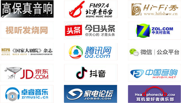 央广音乐之声、音乐广播、文艺广播、人民日报、北京晚报、新京报、参考消息、搜狐、新浪、网易、新华网、京东商城、今日头条、高保真音响、国家大剧院杂志、香港音响技术杂志、台湾音响论坛、新音响杂志、M.A俱乐部、家电大视野、家电论坛、泡泡网、中国数字视听网、IMP3、中关村在线、耳机爱好者俱乐部、卓睿音乐网、HiFi中国音响网、视听发烧网等